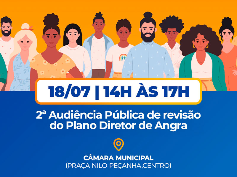 A Prefeitura de Angra dos Reis convida toda a população para participar de mais uma audiência pública sobre a revisão do Plano Diretor do município. O encontro acontecerá no próximo dia 18 de julho, das 14h às 17h, na Câmara Municipal de Angra dos Reis.