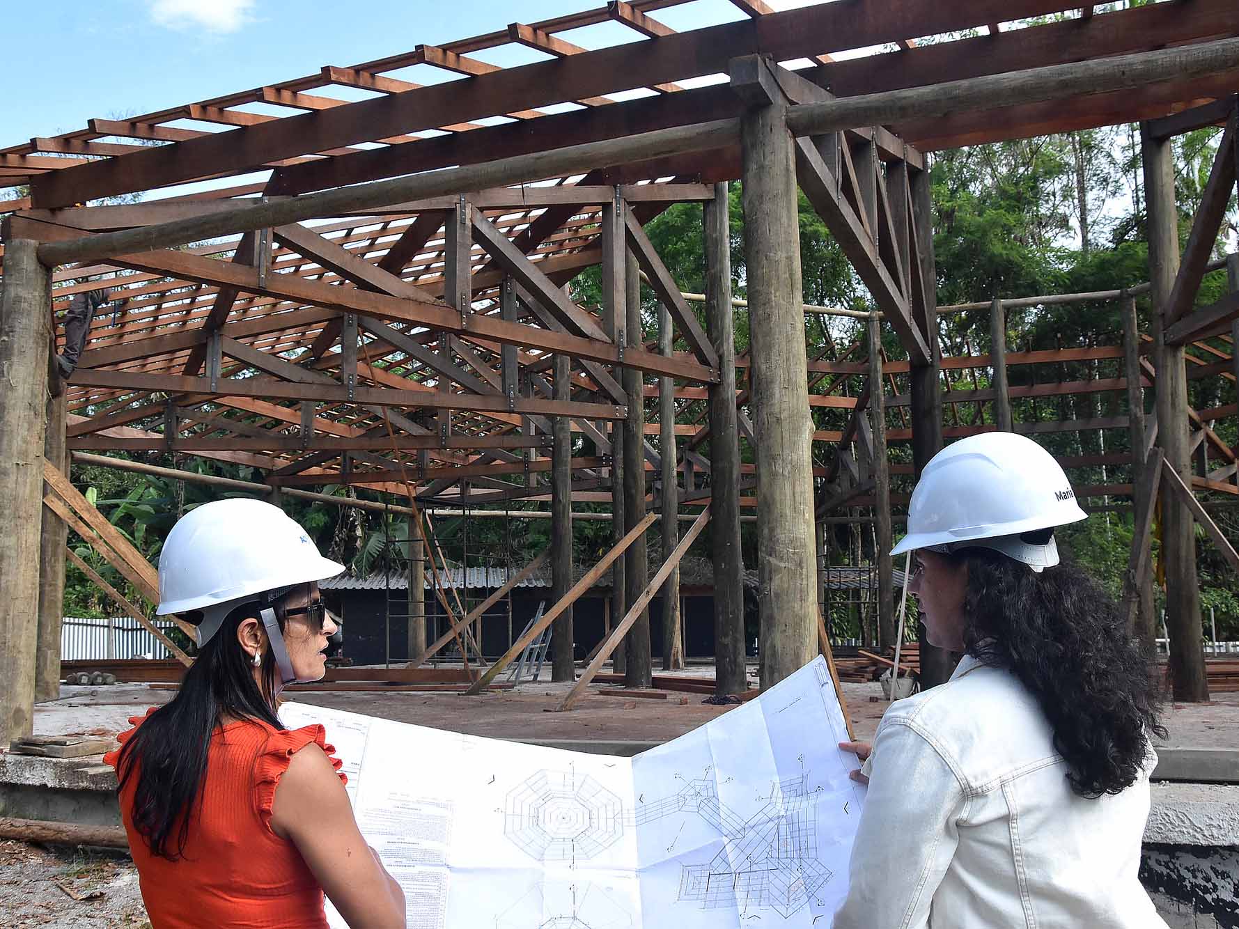 Cerca de 35% da obra já foi concluída. As fundações estão prontas e as lajes de piso em fase final de execução. Paralelamente, estão em andamento a construção da estrutura de madeira e do telhado.