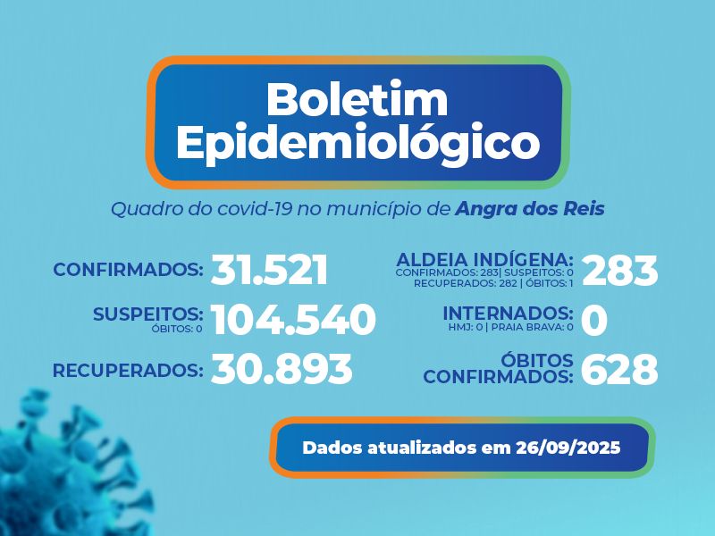 Angra contabiliza 628 mortes pela doença, e nenhum óbito está sob investigação. Há 104.540 casos suspeitos (síndromes gripais). Com a desativação do Centro de Referência Covid-19, o Hospital Municipal da Japuíba (HMJ) e o Hospital de Praia Brava continuam disponíveis para atender os casos de hospitalização por Covid-19. No momento não há pacientes internados.