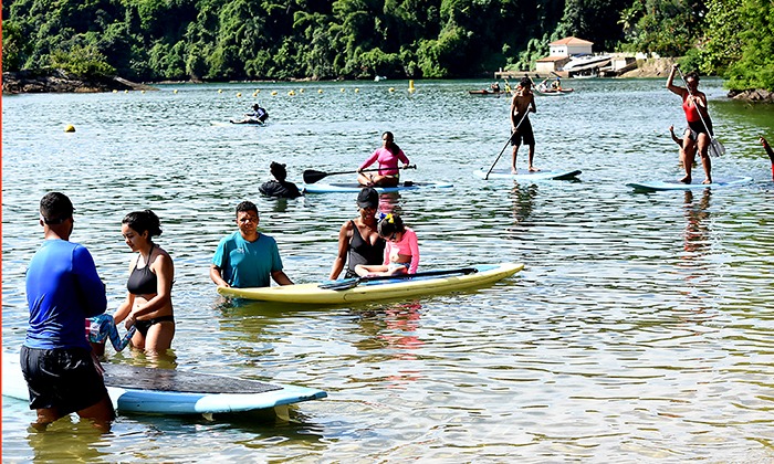 A atividade com as pranchas stand up aconteceu na Praia do Bonfim